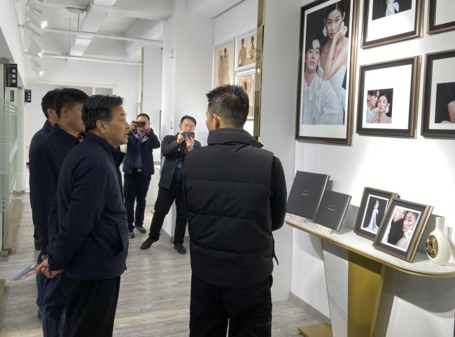 隨后,領導一行人來到入駐基地發展的軍創企業善文相冊公司,該公司總經理吳兆文熱情接待,他首先介紹了自己的創業歷程和企業產品,隨后帶領大家實地參觀生產流水線。作為一名退役軍人,吳兆文始終保持了軍人的嚴謹和部隊作風,退役后成立了善文相冊公司,形成了相片、視頻從拍攝到制作,再到包裝、銷售的業務模型。
