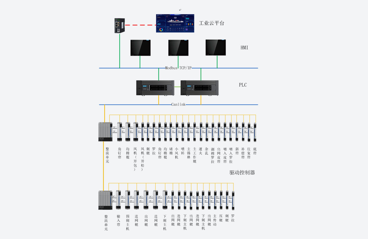 針刺線系統(tǒng)解決方案采用H3U+MD810的方案,采用CAN總線來連接。系統(tǒng)整體解決方案提高現(xiàn)場的設備的穩(wěn)定性,抗干擾性更強。同時,采用共直流母線的電氣設計方案,實現(xiàn)梳理機的不斷網(wǎng),一鍵啟動等功能。兼容遠程物聯(lián)網(wǎng)功能,實現(xiàn)遠程的設備調試,降低了設備的調試周期,提升維護性。