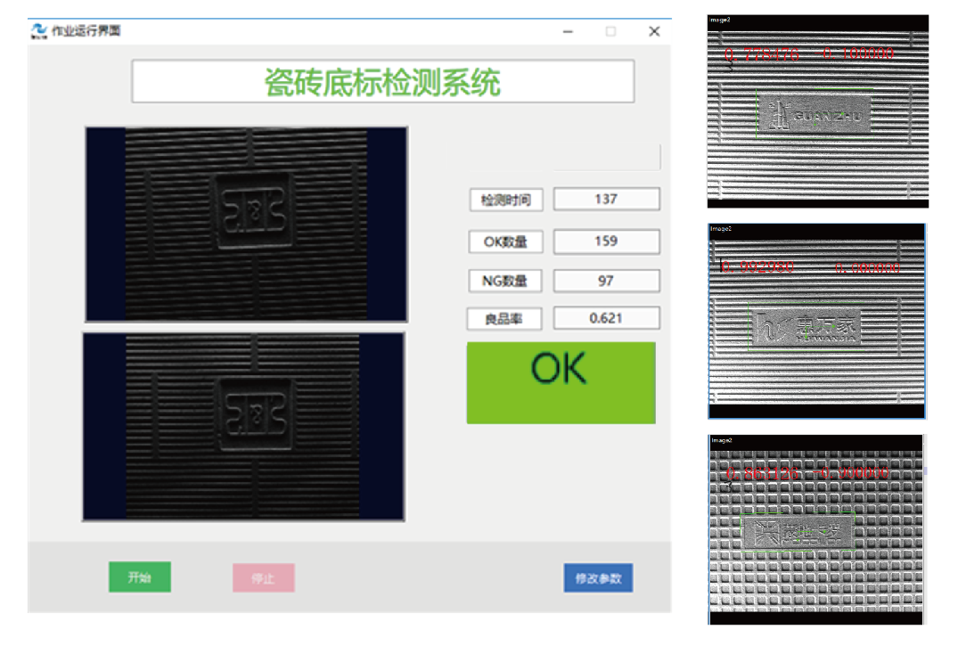 應對勞動力成本攀升和自動化升級的需要,針對陶瓷行業(yè)多種品牌瓷磚混燒下磚時有其他品牌瓷磚混入的情況,開發(fā)了窯尾陶瓷底標識別系統(tǒng),識別非目標品牌并進行剔除,同時能夠支持目標識別品牌的快速切換,便捷的的作業(yè)設(shè)置,簡單的參數(shù)調(diào)節(jié),應用于TOP陶瓷生產(chǎn)企業(yè)。